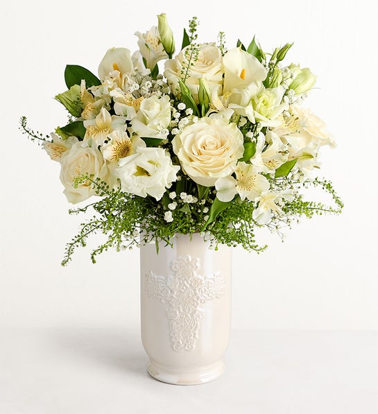White recalls an angelic purity, symbolizing love, peace and remembrance. Our artisanally crafted bouquet warmly expresses your love and heartfelt condolences.
